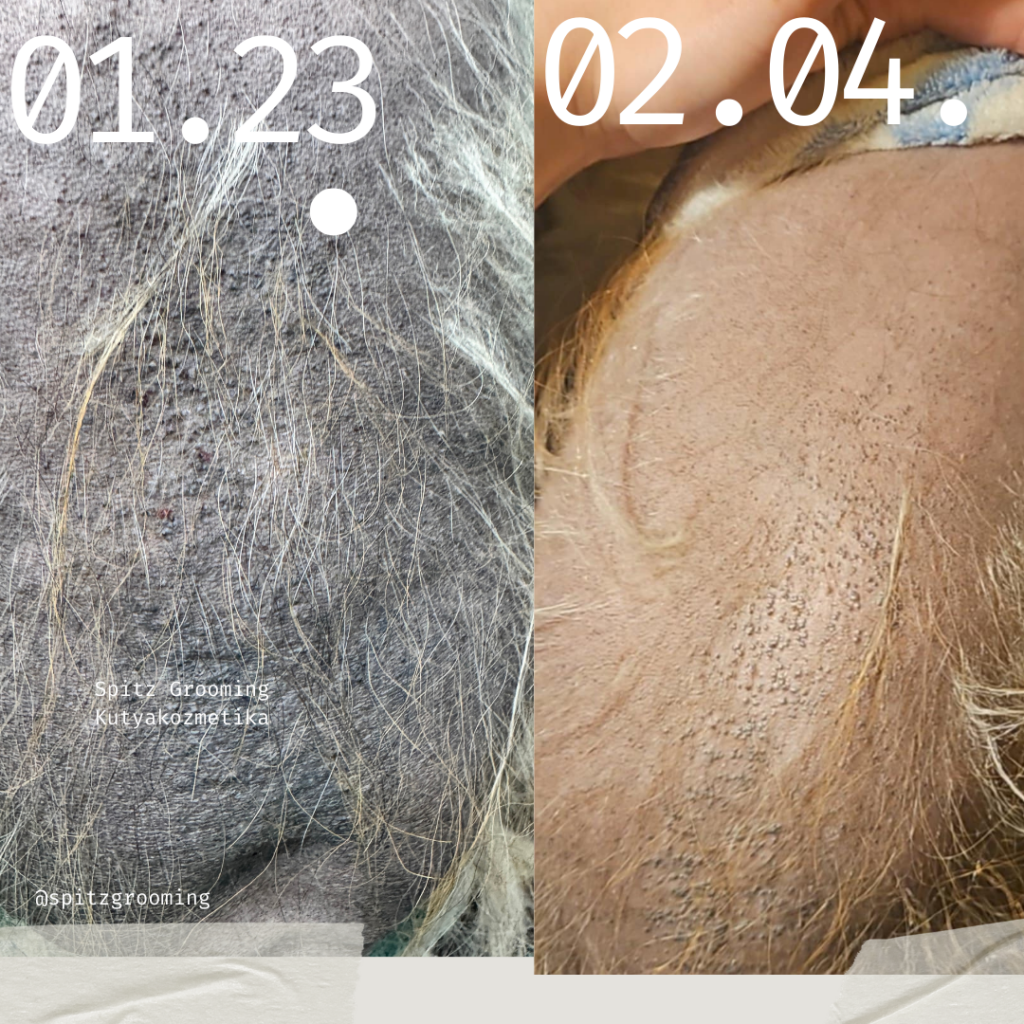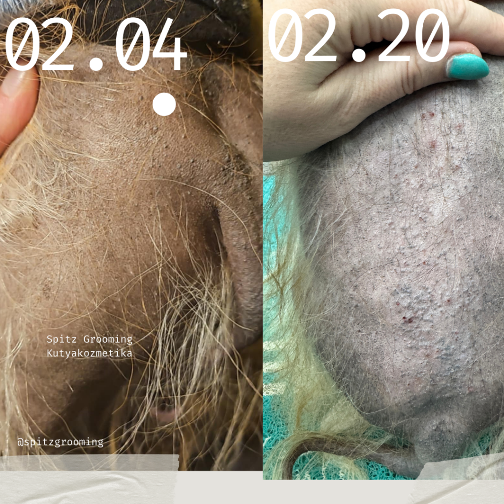 A tapasztalatai azok, hogy sokkal viszketősebbek lettek a kutyusok, viszont az is igaz, hogy hámlik lefelé az az elhalt bőrréteg, ami fekete pigmenttel telítődött. Ugyanakkor a pattanásos rész könnyebben kifakad. Ezen felül a cikkben szereplő pominak a testén megjelentek apró szőrtüszők, hosszabb szőrszálak, amik eddig a gazdi tapasztalatai alapján nem voltak ott.