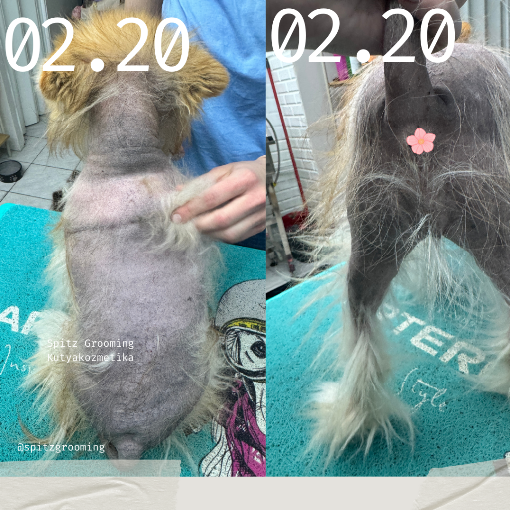 Vendégemnek két kutyusa van, kikkel hozzám jár. Egyiküknek alopécia kezelésre van szüksége, míg a másik kutyusa egyszerűen nem viseli túl jól a kozmetikázás folyamatát. Engem csak nem hagyott nyugodni a korábbi beszélgetéseink alkalmával sem, hogy ha nem bírja a kozmetikát, idegen helyen (a gazditól elviseli <3), akkor hogy tudnék segíteni neki másképp? Tudni kell a kutyusról, hogy 3 éves korában hullott ki a szőre, sajnos elég hamar, most pedig 10 éves. Amellett, hogy ennyi idős, hypothyreosis-ban (pajzsmirigy alul működés) és szívbetegségben is szenved szegénykém, így ő elég hátrányos helyzetből indult. Ezért sem jöttek hozzám kifejezetten alopécia kezelésre, mert itt van ez a két diagnózis is, amit a saját állatorvos gazdijuk vizsgált ki és kezeli. Így mondhatni elfogadta, hogy ezen két belső okok miatt a kutyus a pucér hab testével és vagány otthoni ruhákban rója a mindennapjait. (Szeret öltözni egyébként, ezt tapasztaltam 😀 ) Így ezért is lepődtünk meg és örülünk annak a folyamatnak, ami egy krémhab hatására elindult a kis testén. Nem csodaszer, hangsúlyozom, és nem mindenkinek válhat be! Illetve nem is gyógymódot kínálok, hanem otthoni ápolást javaslok.